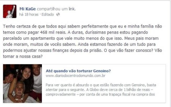 A filha do ex-deputado José Genoino, Miruna Genoino, afirmou em sua página no Facebook que a família não tem como pagar a multa de cerca de R$ 468 mil pela qual ele foi condenado no julgamento do mensalão. A Vara de Execuções Penais (VEP) do Distrito Federal determinou ontem que o pagamento seja feito em dez dias e se refere à condenação por corrupção.